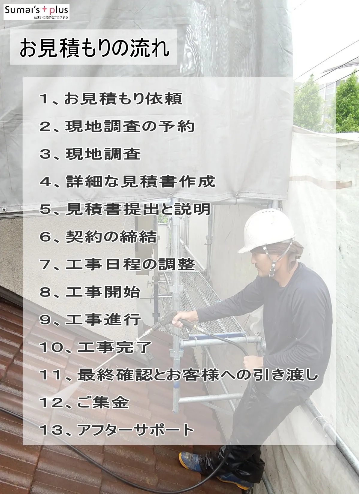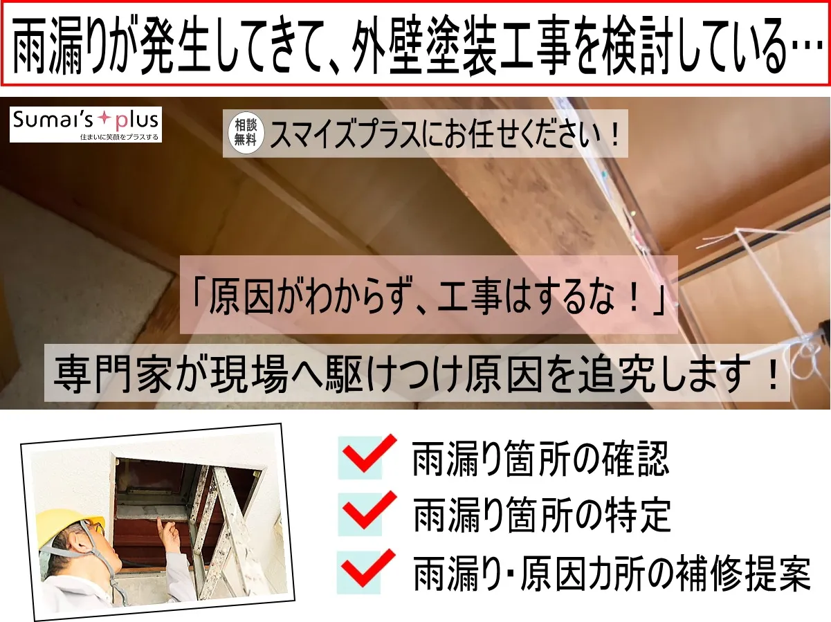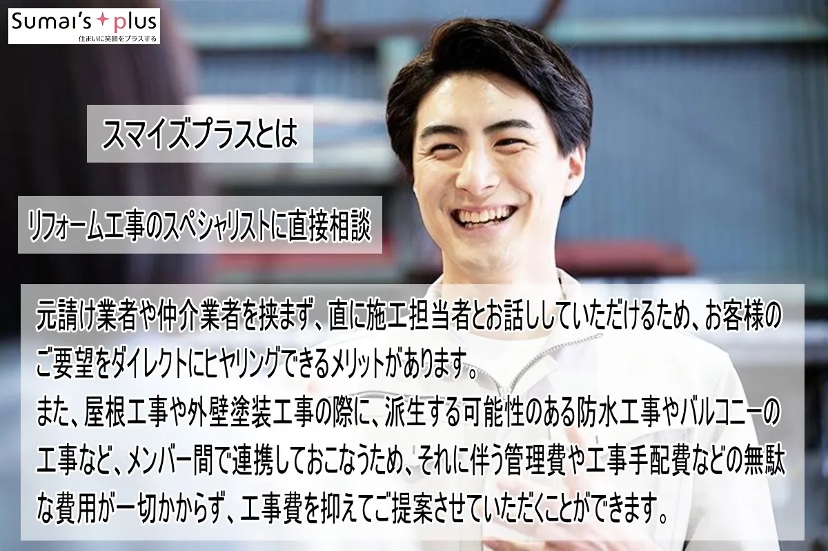 屋根工事や外壁工事、外壁塗装工事や防水工事、バルコニー工事など、他の業種の工事が派生した際も連携してそれぞれの専門会社が直接工事を請け負います。「無駄な管理費等がかからない」この部分がスマイズプラスへご依頼いただく大きなメリットです。