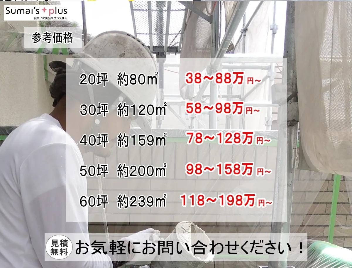 外壁塗装の参考価格に含まれる費用は、塗装代をはじめ、足場、飛散防止ネット養生、下地処理、高圧洗浄、シーリング、軒、雨樋、産業廃棄物処分、交通費・運搬費などです。※参考価格となりますので、実際の状況や面積等で、価格が前後することをご了承ください。